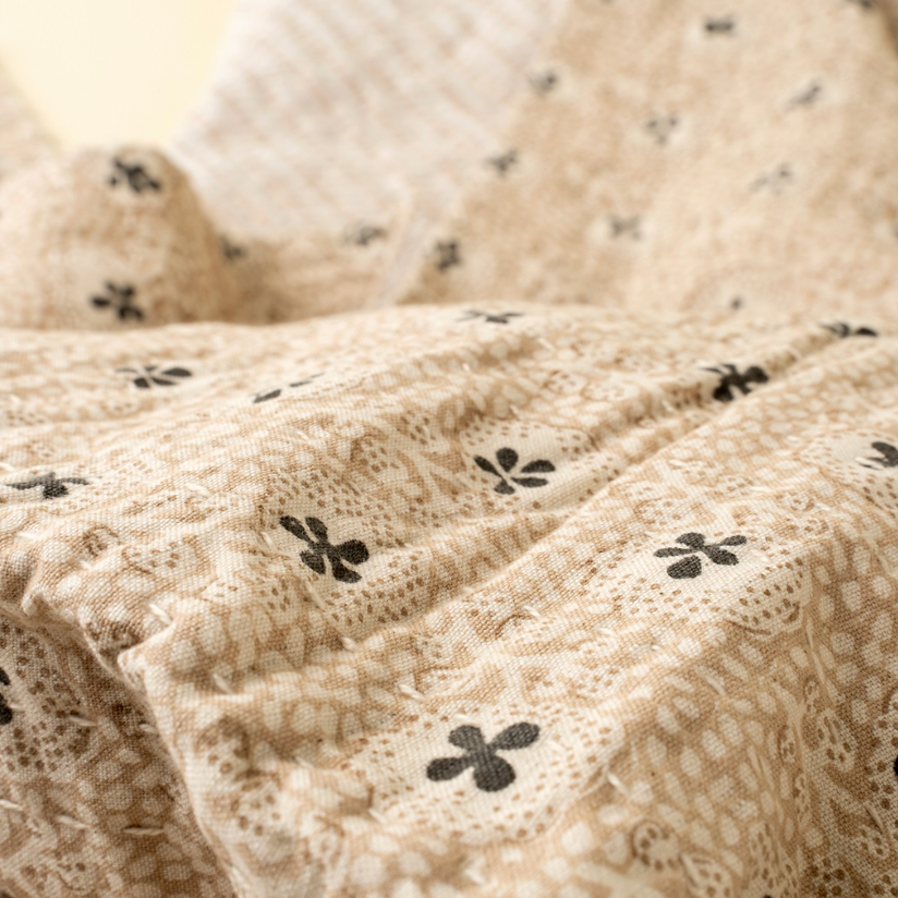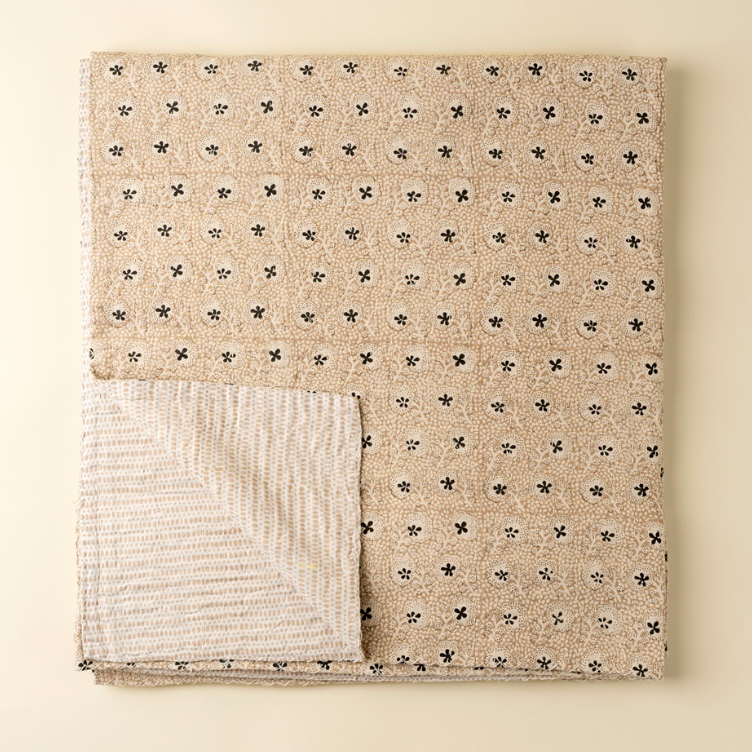 Crafted for lovers of texture and tradition, the Clover Block Print Kantha Bed Blanket adds a soulful layer to your sustainable bedding. Featuring a neutral floral block print and stitched by hand, it brings quiet charm and eco-conscious warmth to any bedroom.