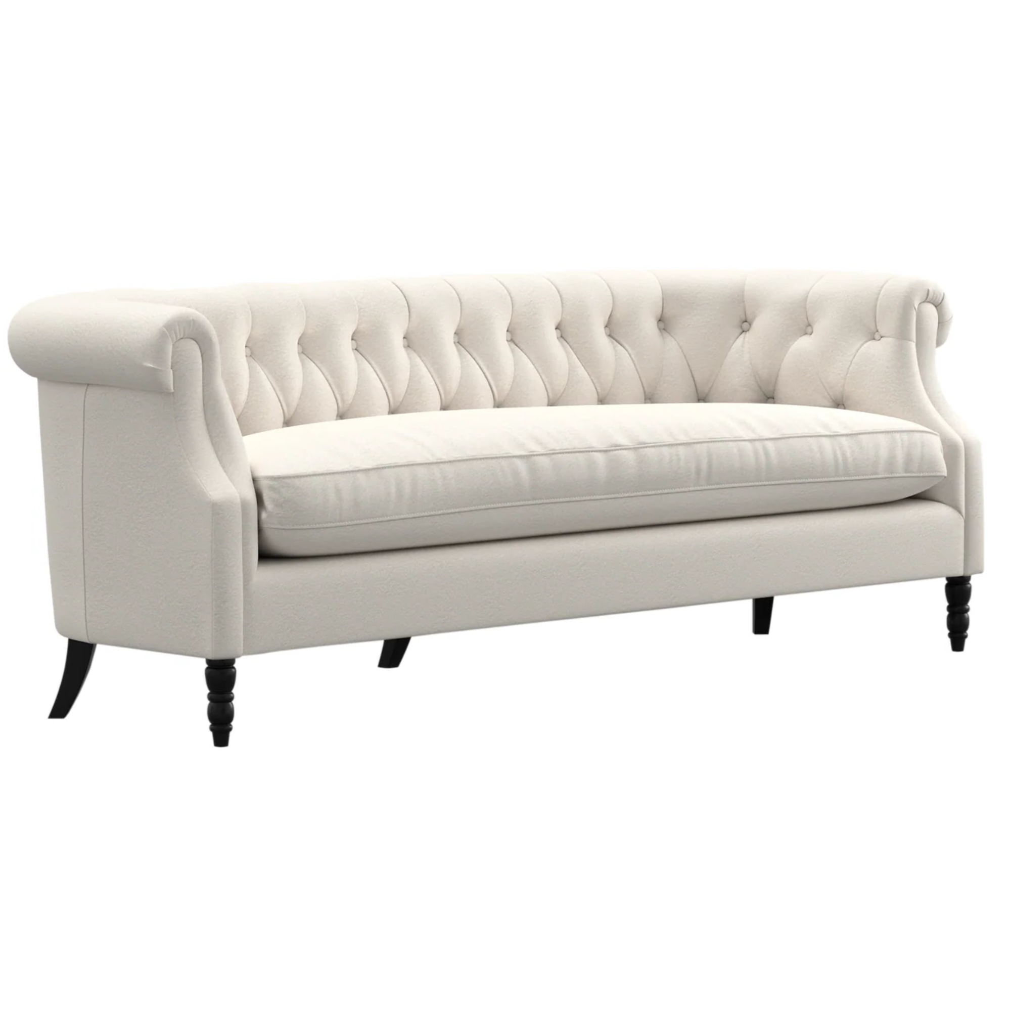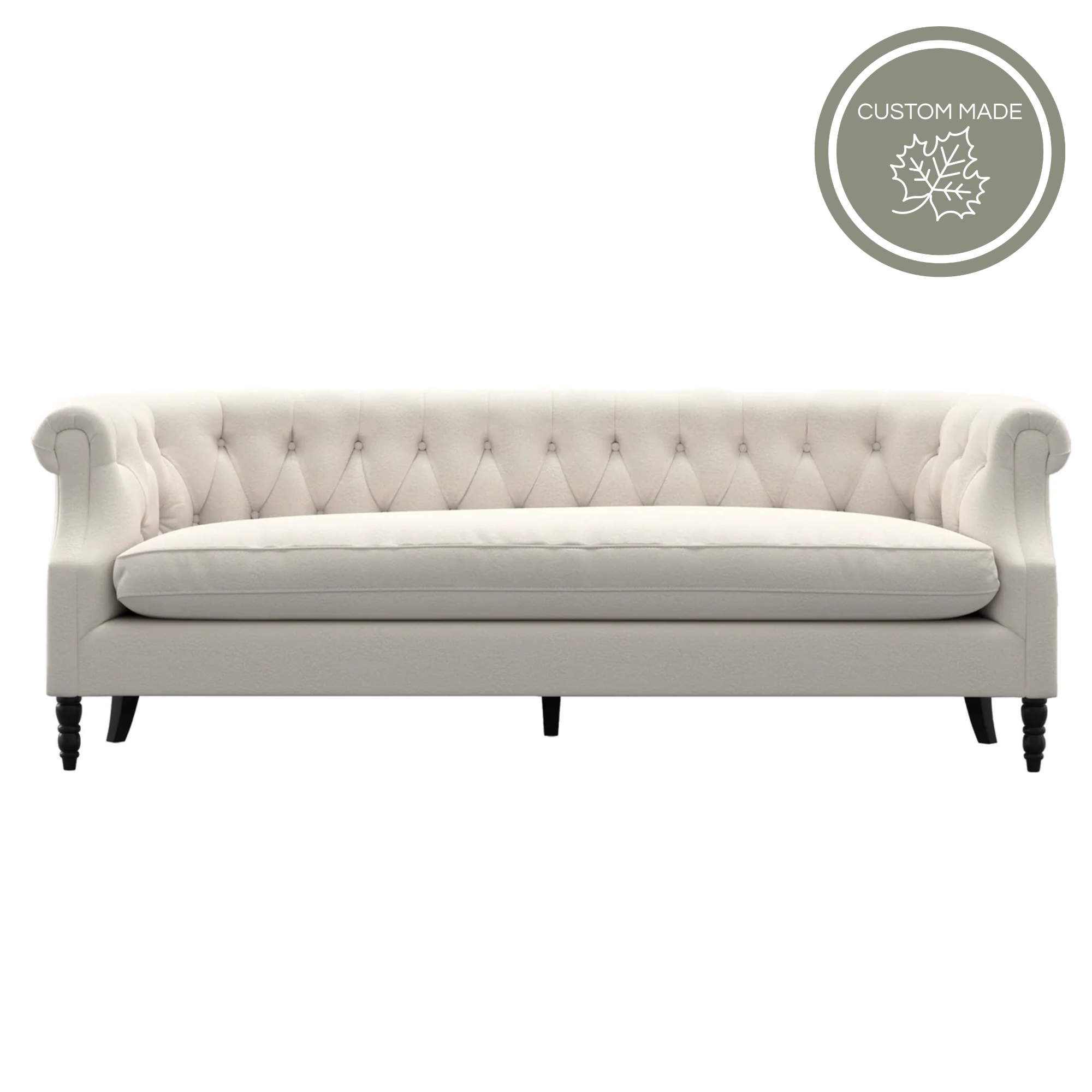 The Alice Sofa is a timeless statement piece inspired by classic chesterfield styling. Featuring elegant rolled arms and a beautifully tufted back, this sofa brings sophistication and character to any living space while offering exceptional comfort. The deep diamond-tufted back creates a refined, tailored look, while the plush seat cushion made with foam wrapped in a feather and fibre blend provides a soft yet supportive place to relax.
