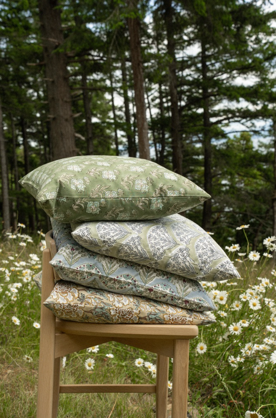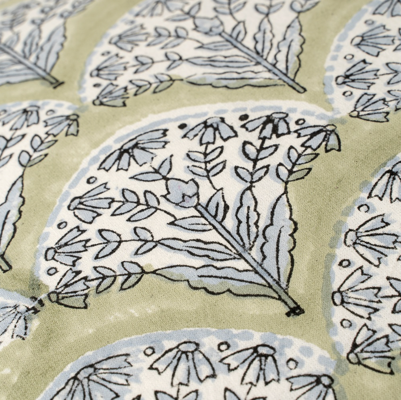 Brighten your home with the Sakura Block Print Pillow, a decorative pillow designed to delight. Hand block printed by skilled artisans in India, this modern decorative pillow features a fan-like pattern of floral sprays in rich pinks, greens, and creams on a soft blue base. Made from 100% organic cotton, it's the perfect way to bring artisanal detail and seasonal colour into your collection of accessory pillows.